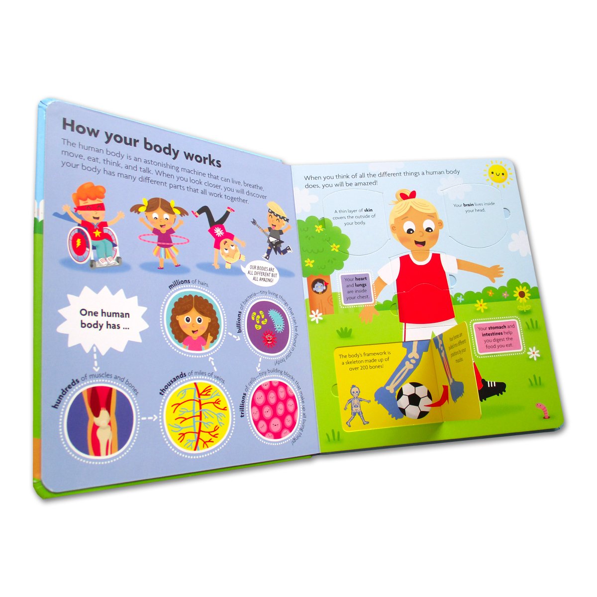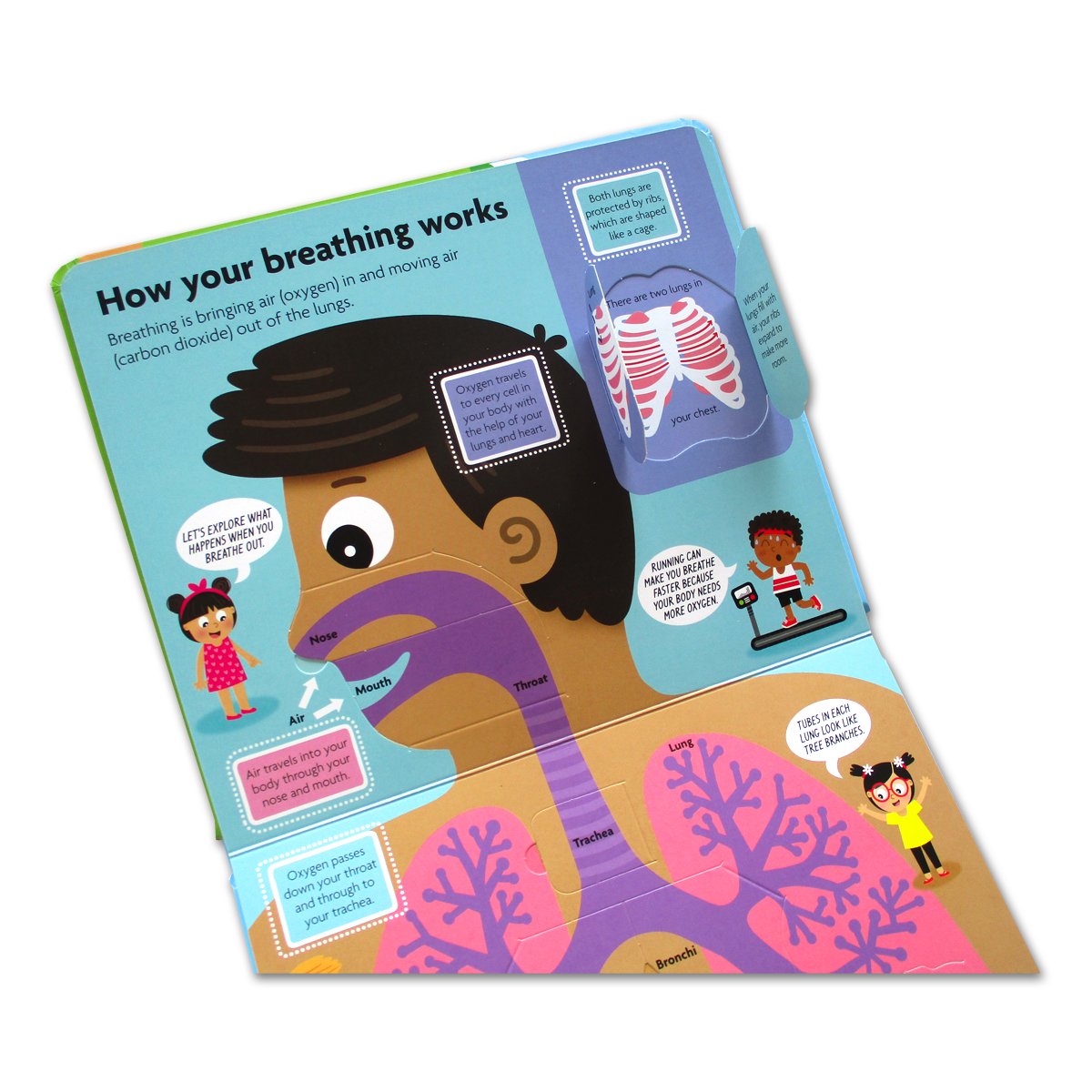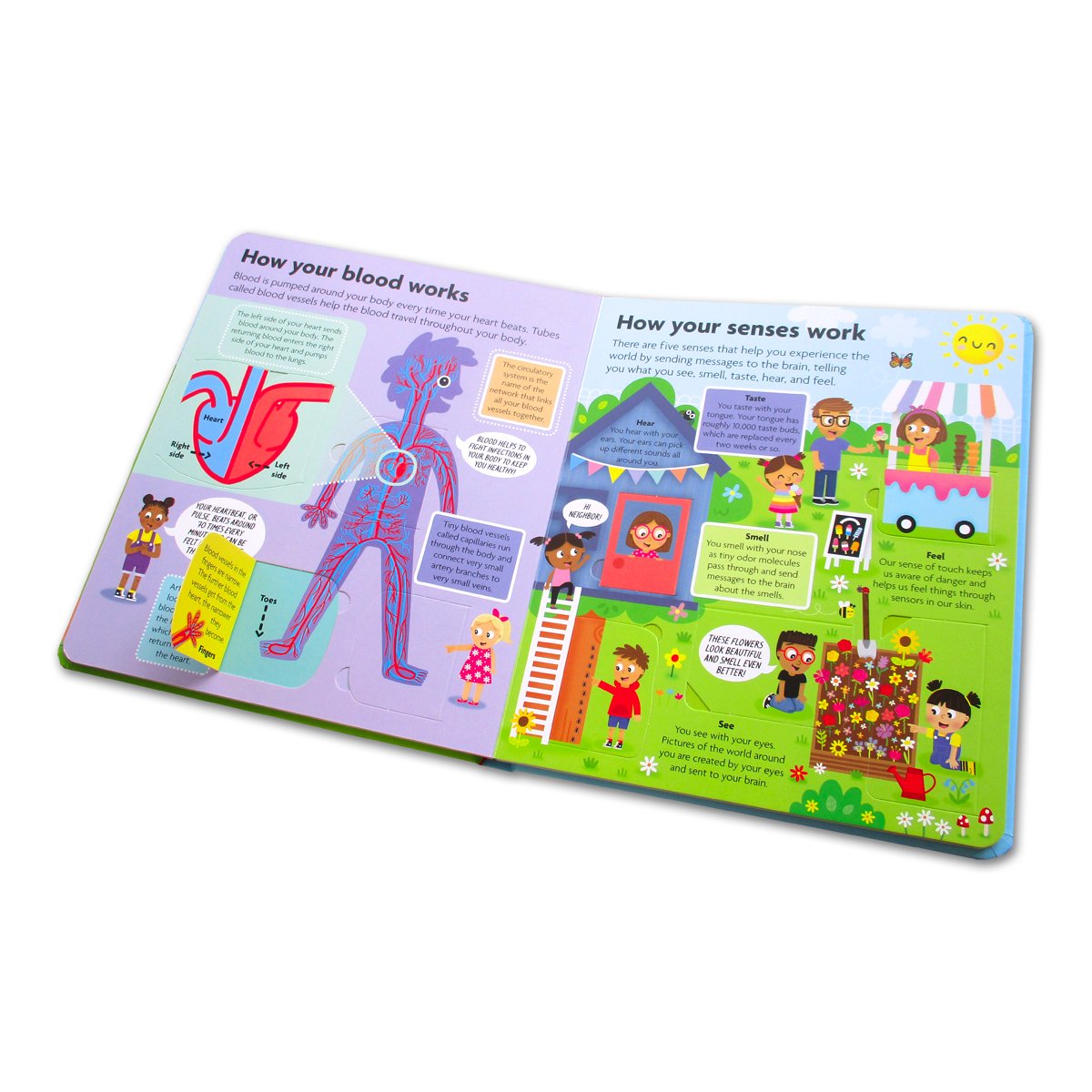 Dan disertai dengan lebih dari 50 flap (semacam jendela yang bisa dibuka-buka, di baliknya ada gambar lagi) Setiap flaps mengenalkan fakta menarik dan detail tersembunyi tentang berbagai sistem, organ, dan proses tubuh, menjadikan pembelajaran tentang tubuh manusia lebih menyenangkan dan menarik.