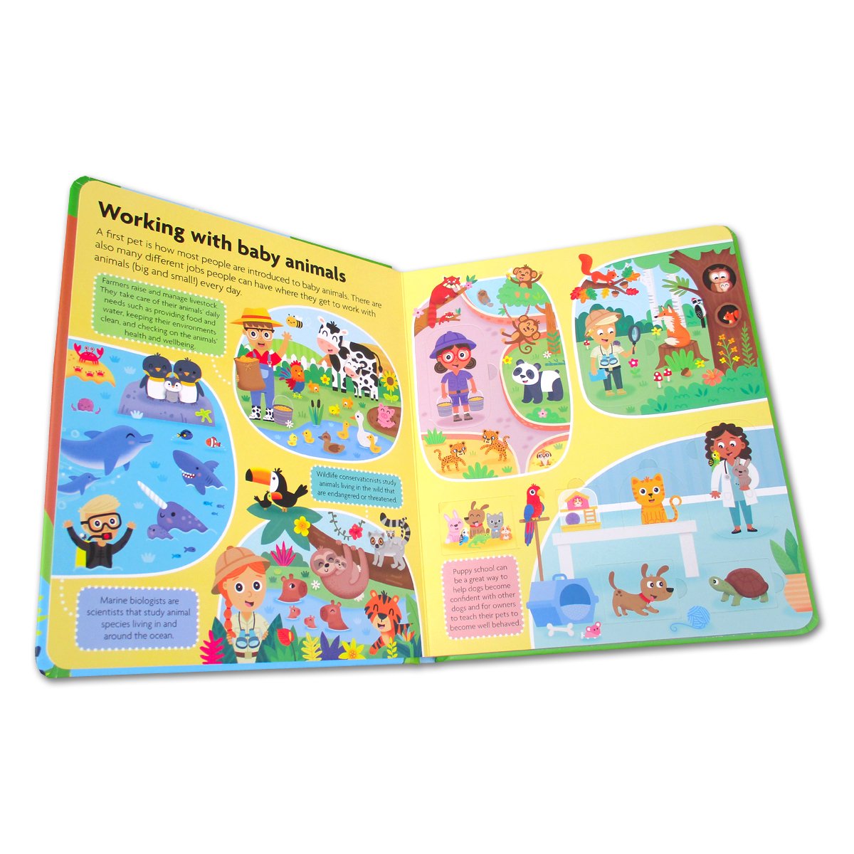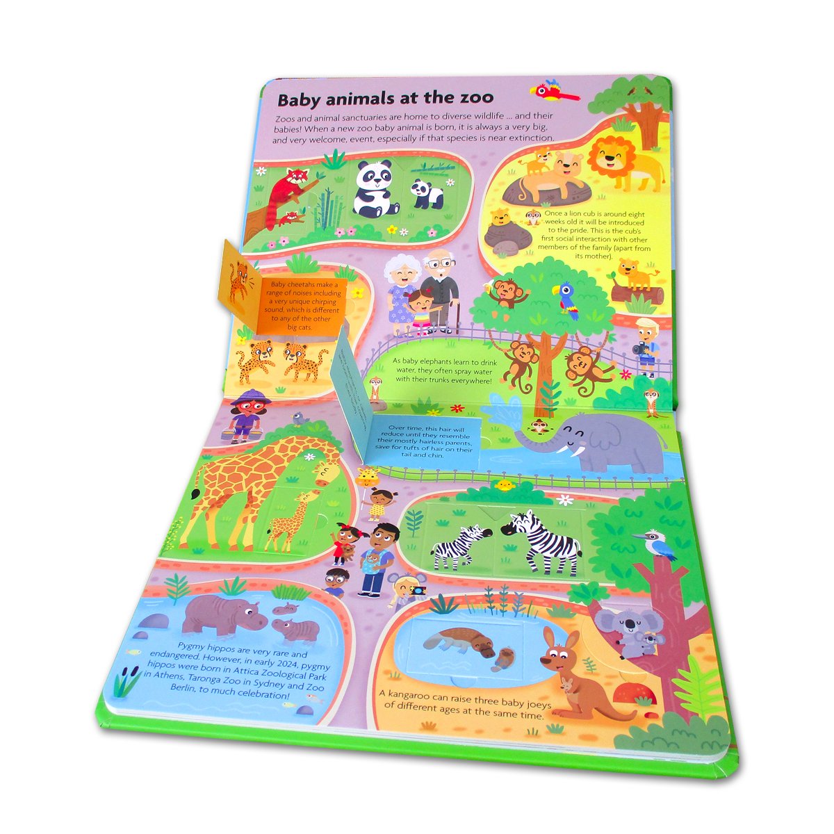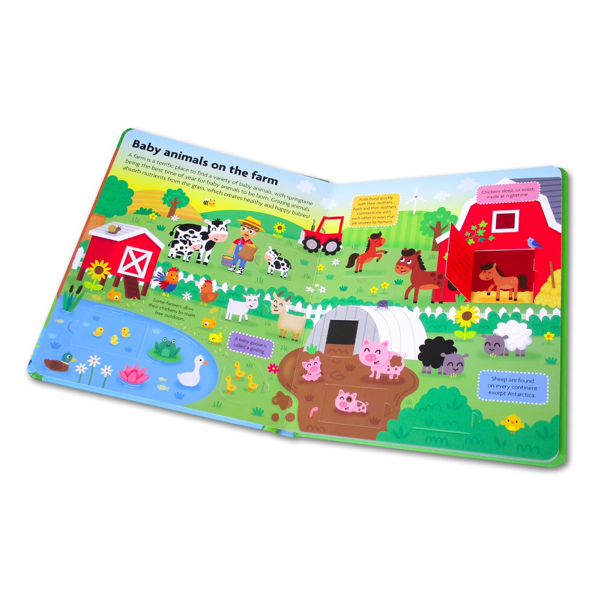 Dan disertai dengan lebih dari 50 flap (semacam jendela yang bisa dibuka-buka, di baliknya ada gambar lagi) Setiap flaps mengenalkan fakta menarik dan detail tersembunyi tentang hewan di peternakan, kebun binatang, hutan dll menjadikan pembelajaran tentang baby animals lebih menyenangkan dan menarik.