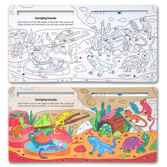 Cukup siapkan kuas dan air saja! Basahi kuasnya, kuas-kuaskan ke gambarnya dan tadaaaa.... Ajaib!! Gambarnya akan jadi berwarna looh!! (Sudah include kuas).