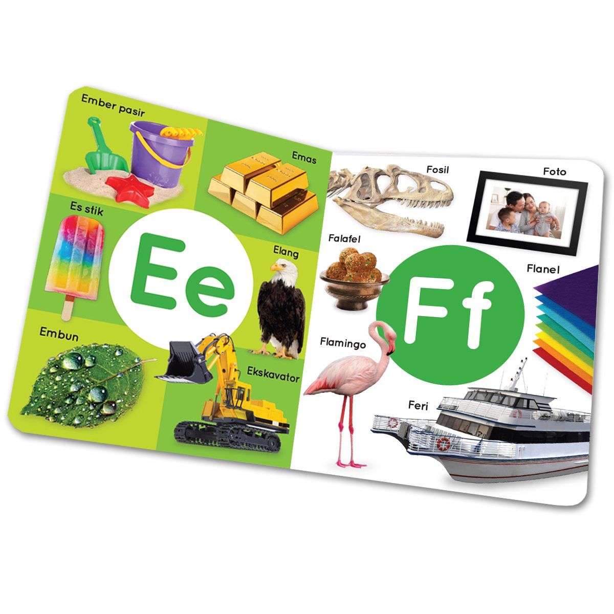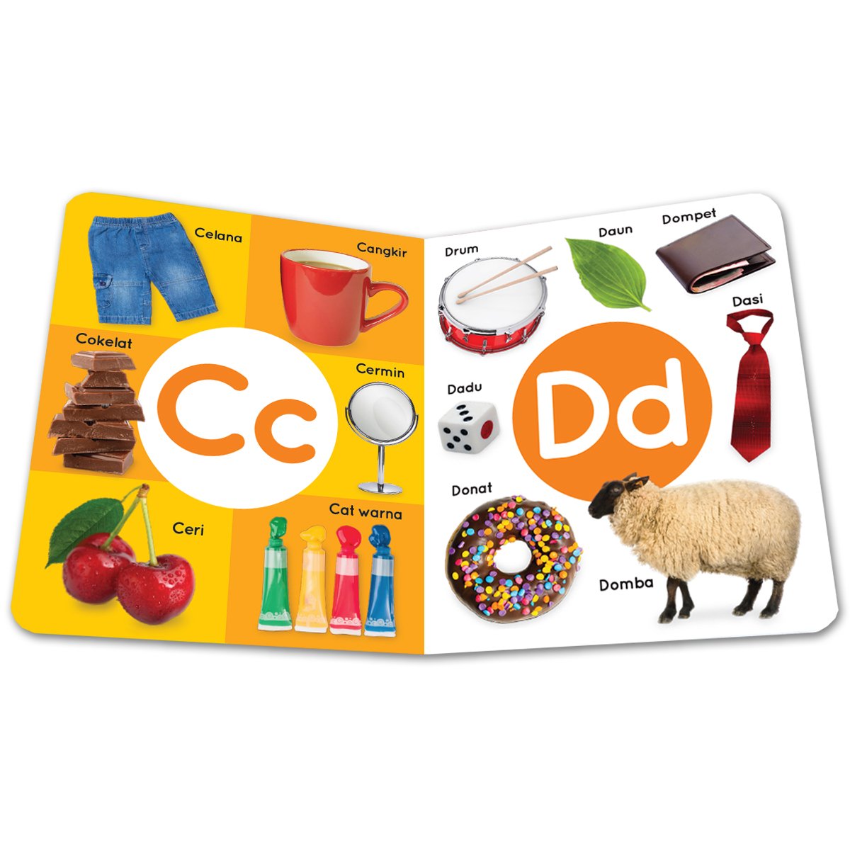 bukunya berisi Pengenalan ABC lengkap dari A-Z disertai dengan pengenalan 100 kata pertama dikenalkan dalam 2 bahasa (Indonesia & Inggris) dengan warna-warni yang sangat menarik.